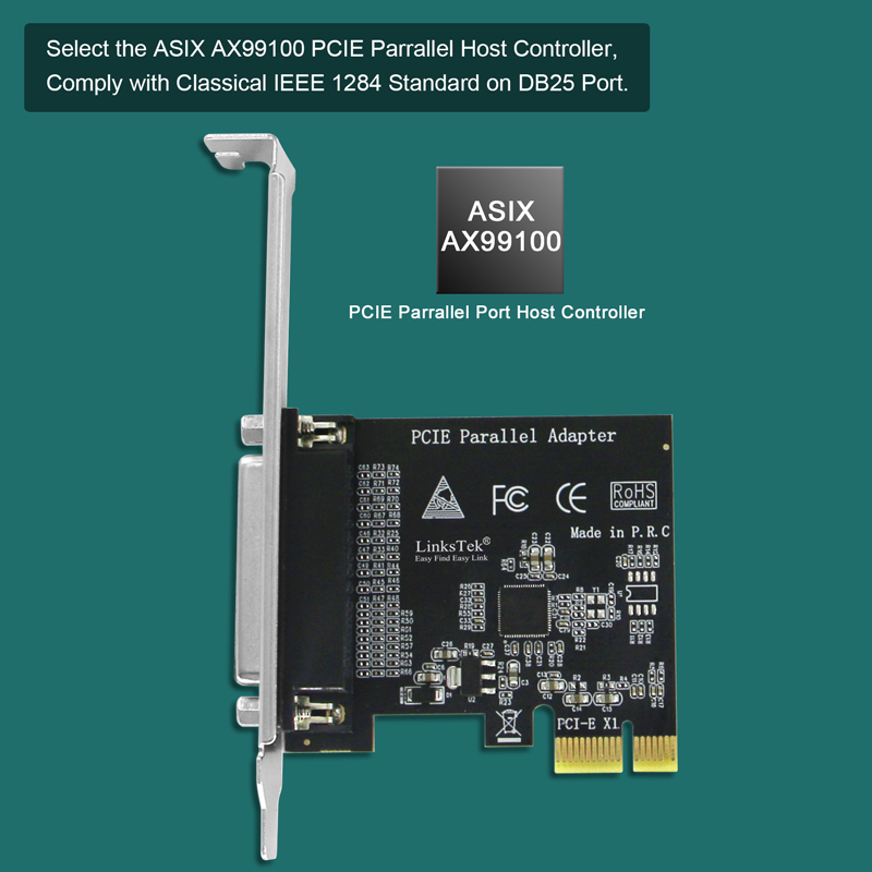 LinksTek PCIE-PA1 is a PCI Express X1 interface to 1-Ports DB25 parallel LPT port card. It is based on ASIX AX99100 PCIE to parallel host controller solution, will compatible with most of Intel, AMD and ARM hardware platform on Windows OS and Linux kernel systems. Allow users add 1-Parallel DB25/LPT port on desktop PCs, working stations or industrial device by a single PCIE slot. Fully support IEEE 1284 protocol, Supports ECP (enhanced capability port), EPP (enhanced parallel port), SPP (standard parallel port), Nibble, Byte mode will work on most of parallel port peripherals device such as printers, scanners, CD-R/RW drives, memory card readers, bar code scanners etc.