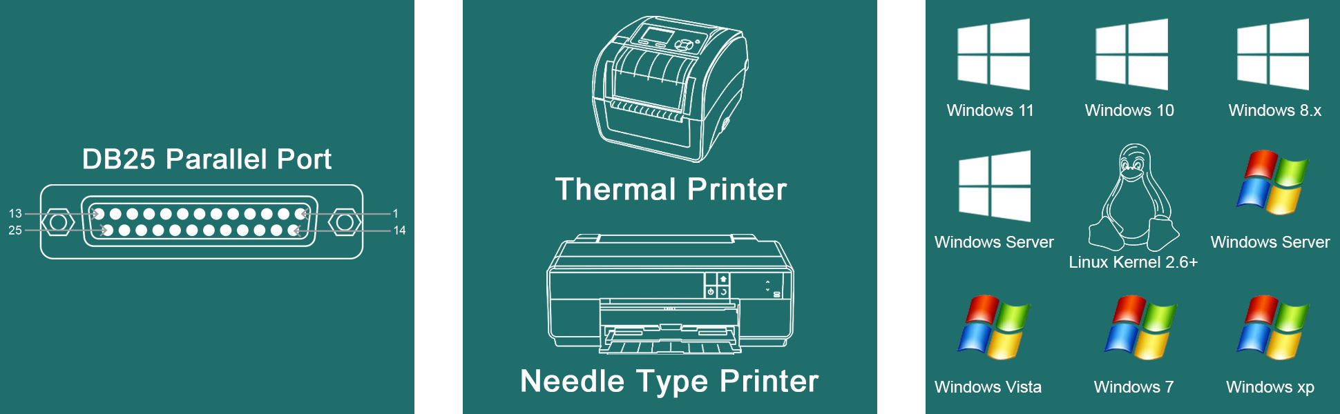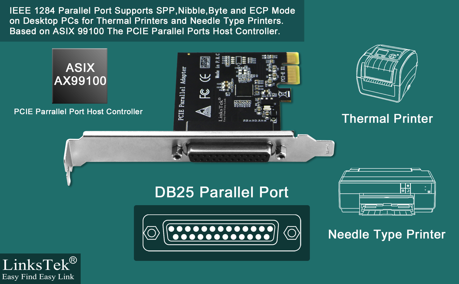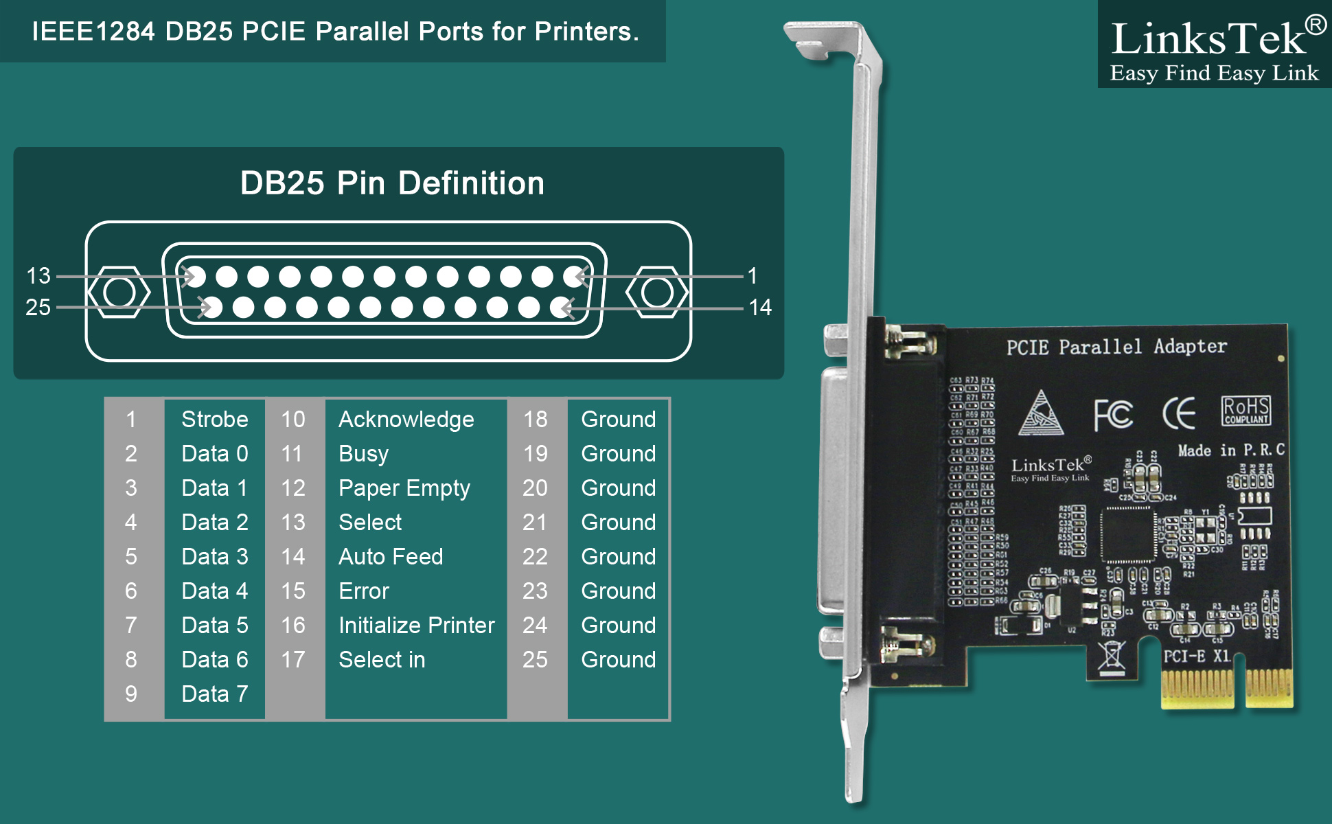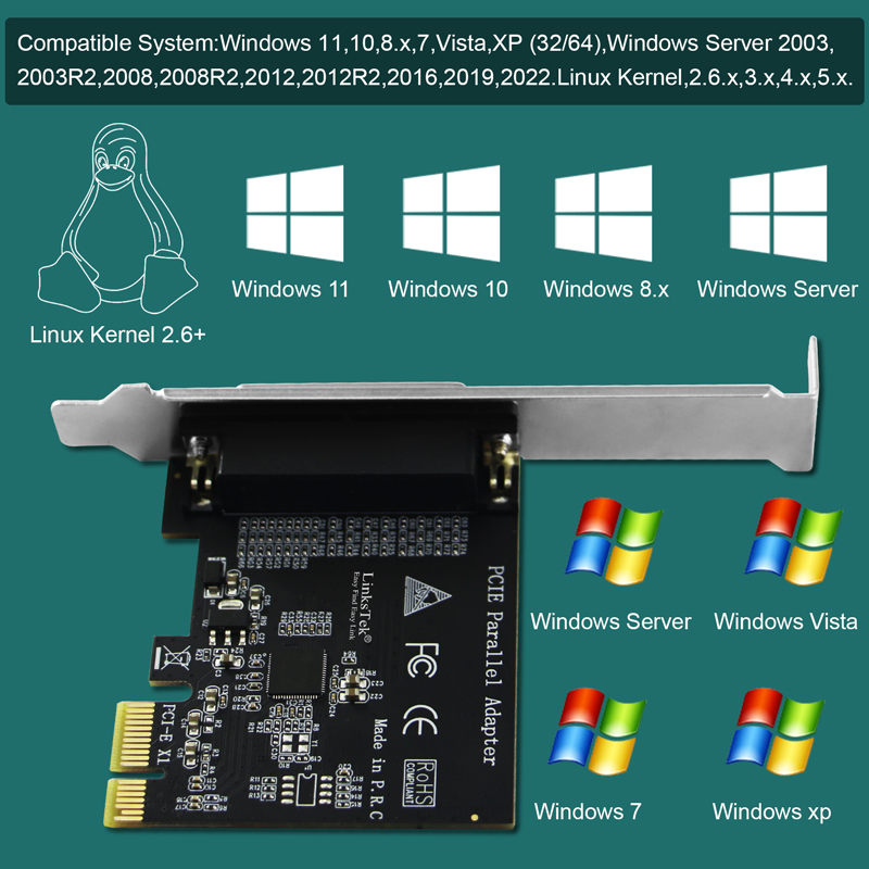 1. IEEE 1284, DB25 Pin Parallel LPT Port: Fully compatible with IEEE 1284 standard DB25 pin Parallel LPT port. Will light up DB25 ports devices on desktop PCs.