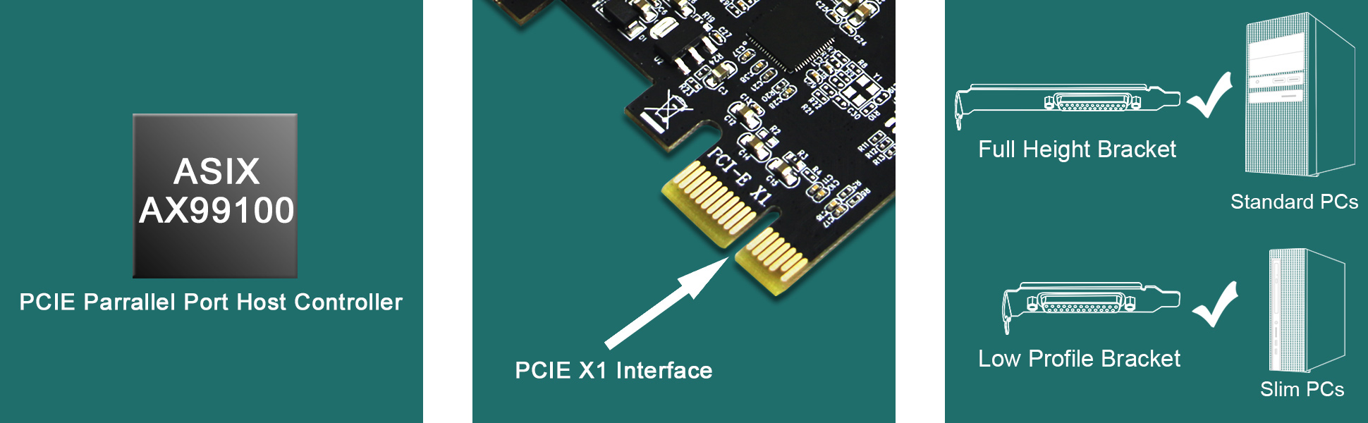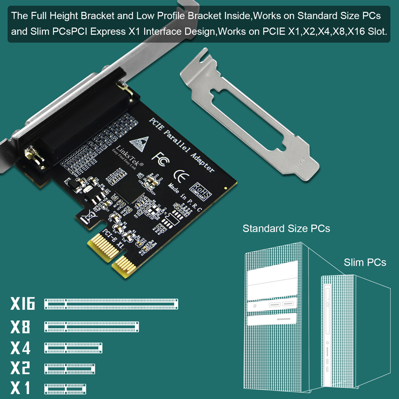 PCIE parallel card, will work on standard size PCs. The low profile bracket in the package, will works on slim PCs.